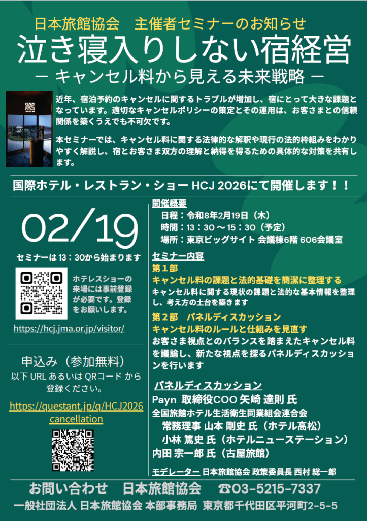 (日本旅館協会)【2026年2/19】キャンセル料に関するセミナーのご案内